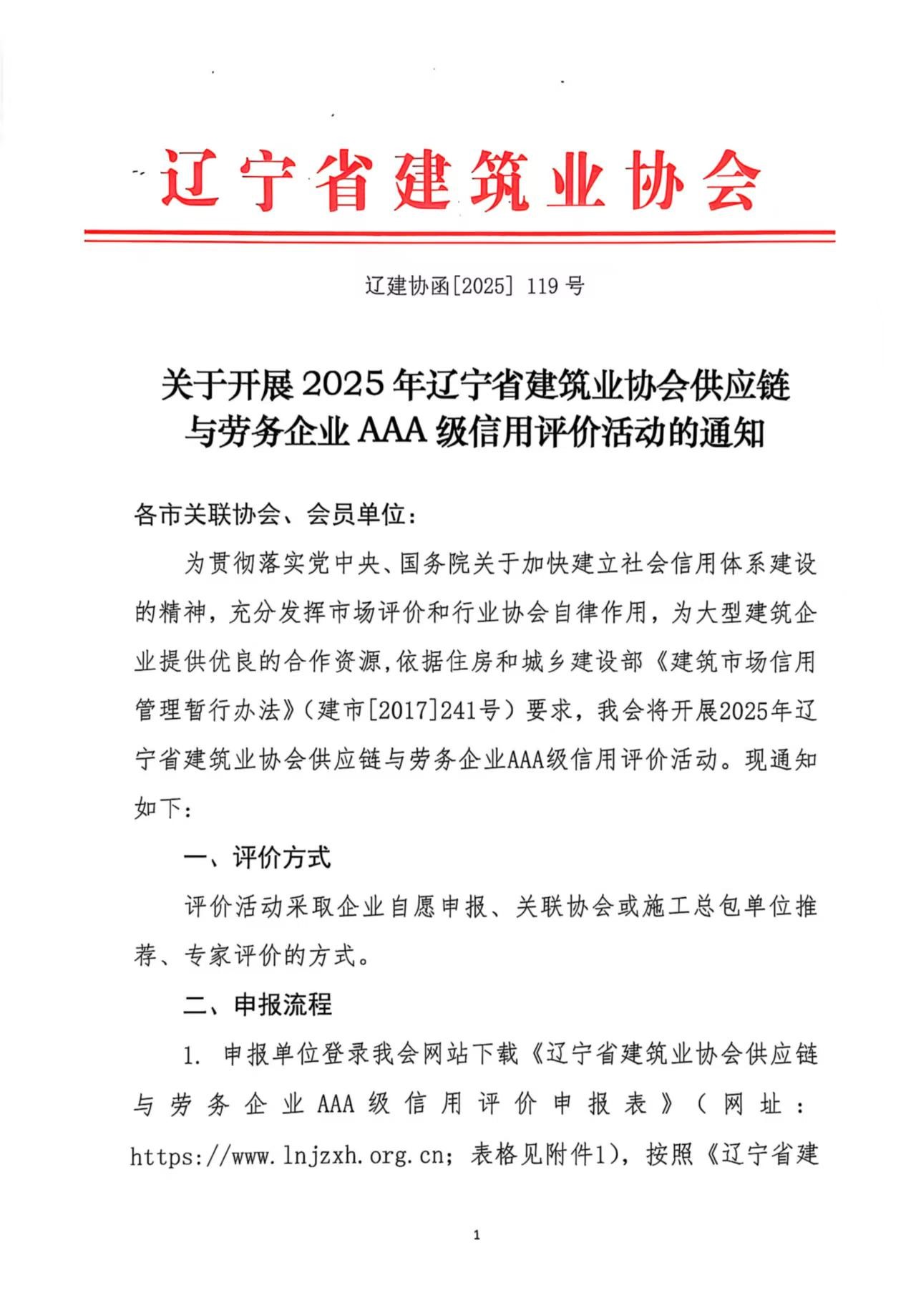 >关于开展2025年辽宁省建筑业协会供应链与劳务企业AAA级信用评价活动的通知