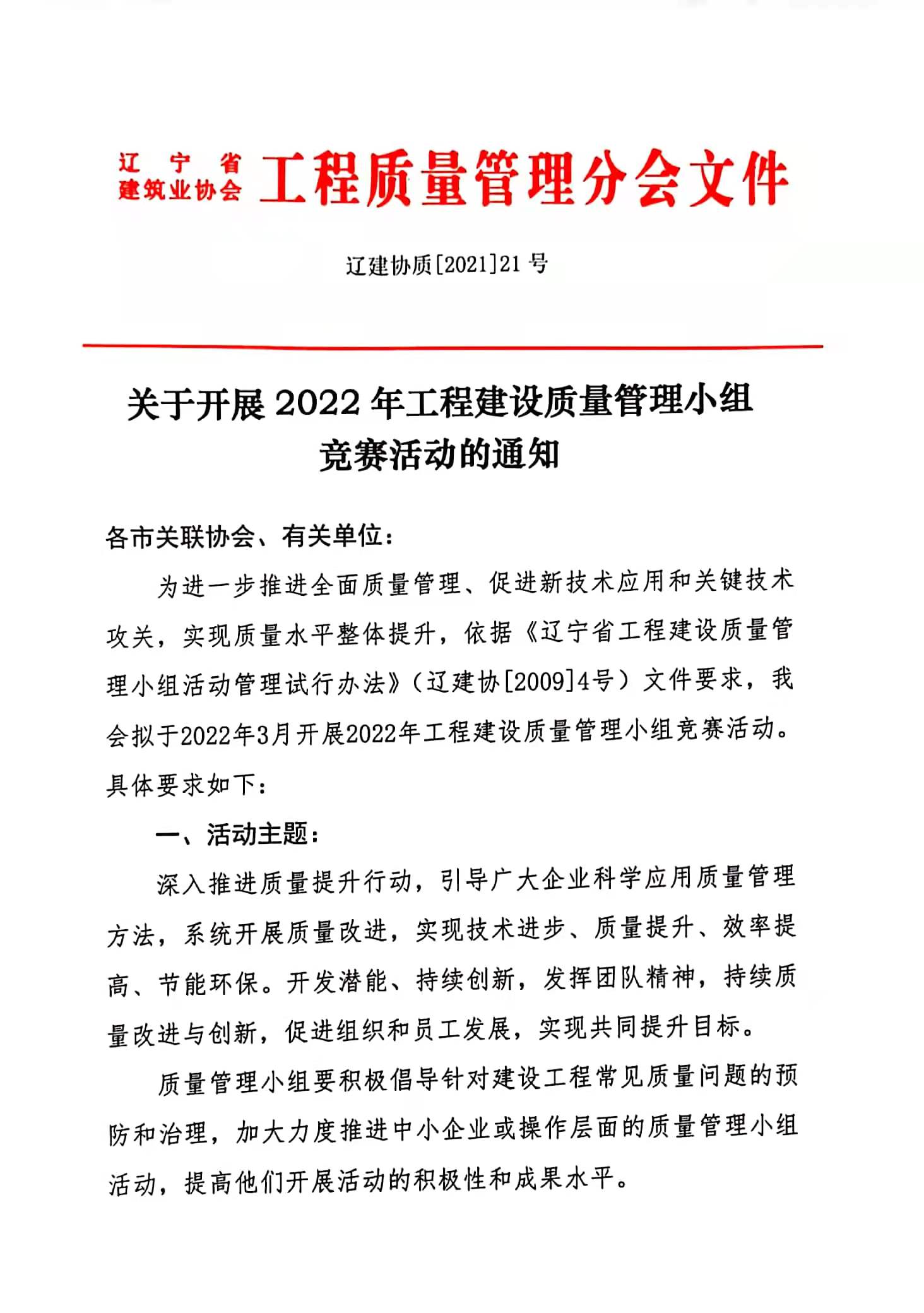 >关于开展2022年工程建设质量管理小组竞赛活动的通知